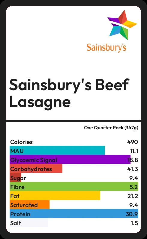 Sainsbury's Beef Lasagne contains 489.3 calories in one Quarter Pack (347g).