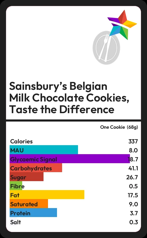 Sainsbury’s Belgian Milk Chocolate Cookies, Taste the Difference contains 26.7g sugar in one Cookie (68g) - that is around 7 cubes of sugar.