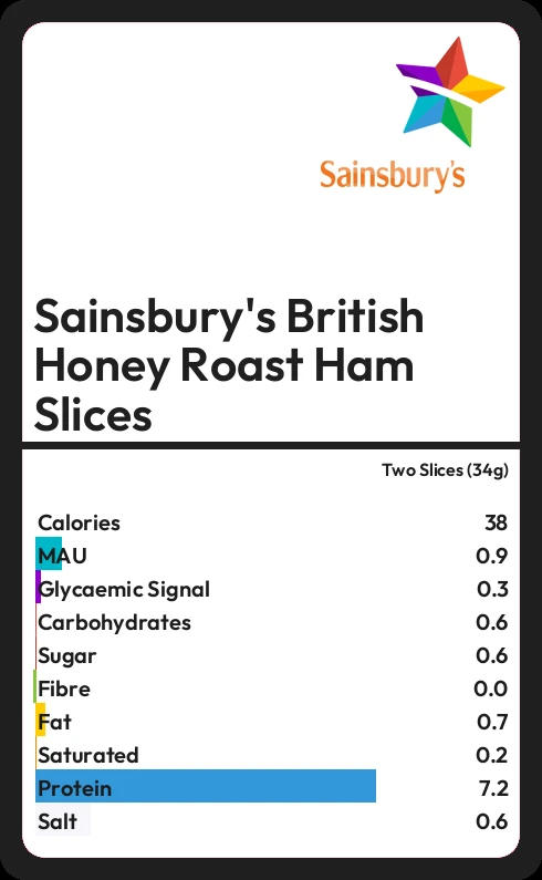 Sainsbury's British Honey Roast Ham Slices contains 0.6g sugar in two Slices (34g)