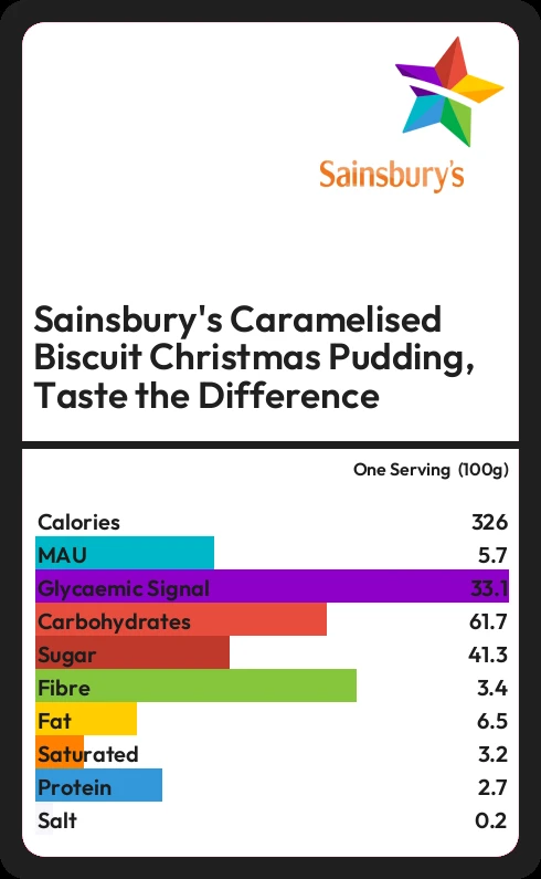 Sainsbury's Caramelised Biscuit Christmas Pudding, Taste the Difference contains 41.3g sugar in one Serving (100g) - that is around 10 cubes of sugar.