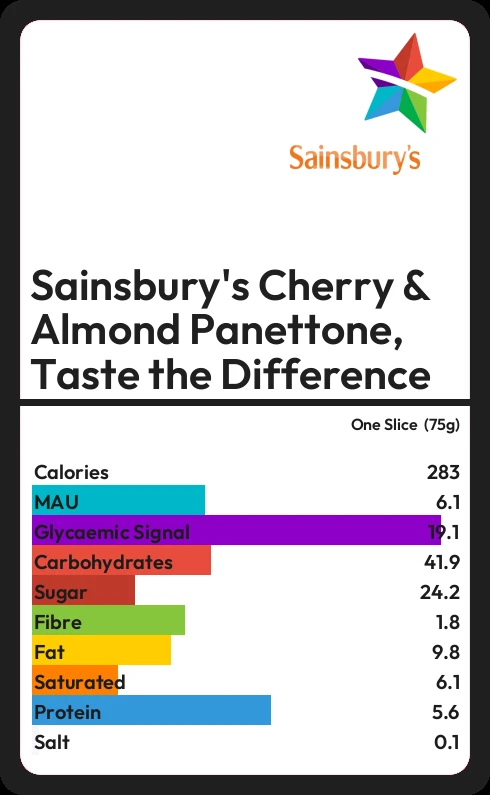 Sainsbury's Cherry & Almond Panettone, Taste the Difference contains 282.8 calories in one Slice (75g).