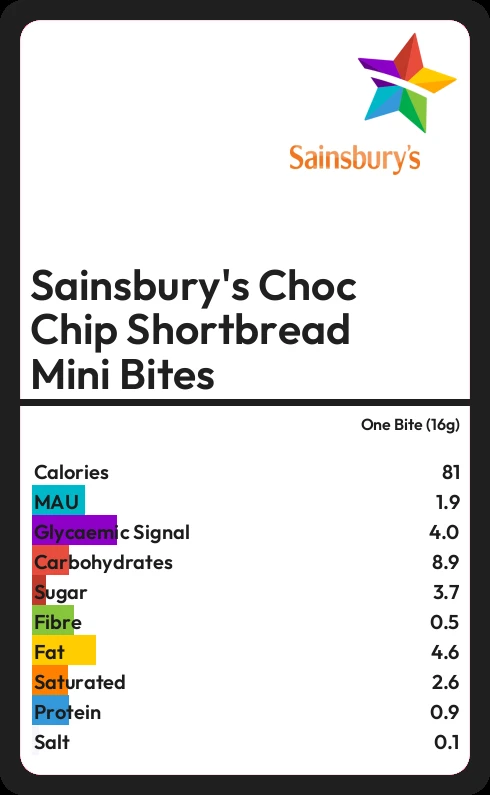 Sainsbury's Choc Chip Shortbread Mini Bites contains 3.7g sugar in one Bite (16g) - that is around 1 cube of sugar.