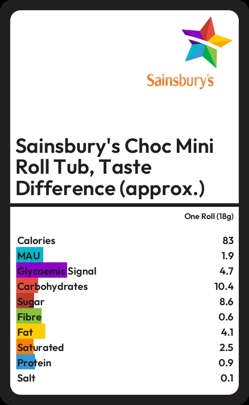 Sainsbury's Choc Mini Roll Tub, Taste Difference (approx.) contains 8.6g sugar in one Roll (18g) - that is around 2 cubes of sugar.