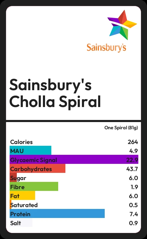 Sainsbury's Cholla Spiral contains 264.1 calories in one Spiral (81g).