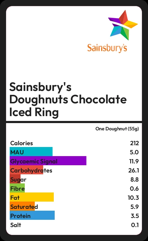 Sainsbury's Doughnuts Chocolate Iced Ring contains 8.8g sugar in one Doughnut (55g) - that is around 2 cubes of sugar.