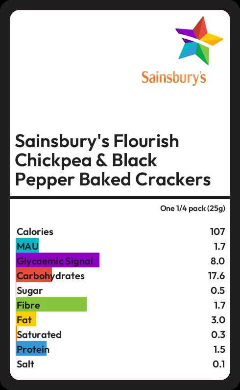 Sainsbury's Flourish Chickpea & Black Pepper Baked Crackers contains 106.8 calories in one 1/4 pack (25g).