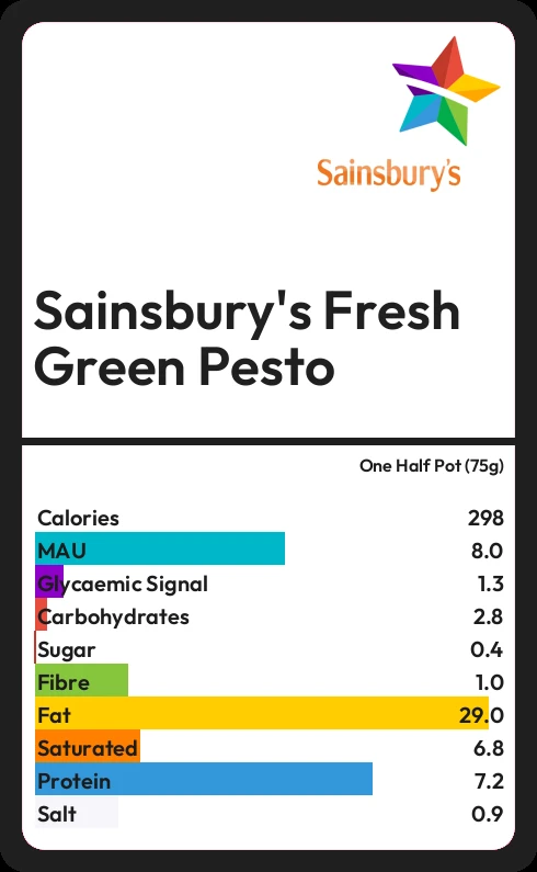Sainsbury's Fresh Green Pesto contains 298.5 calories in one Half Pot (75g).