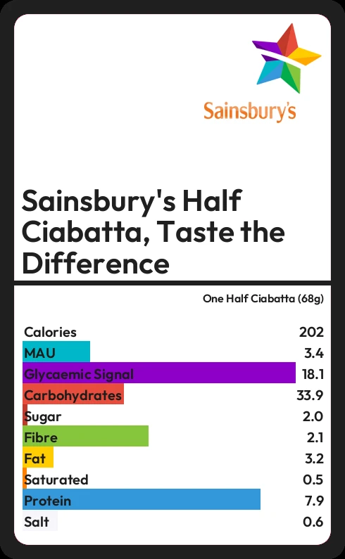 In one Half Ciabatta (68g) of Sainsbury's Half Ciabatta, Taste the Difference there are 3.2g of fat of which 0.5g are saturated.