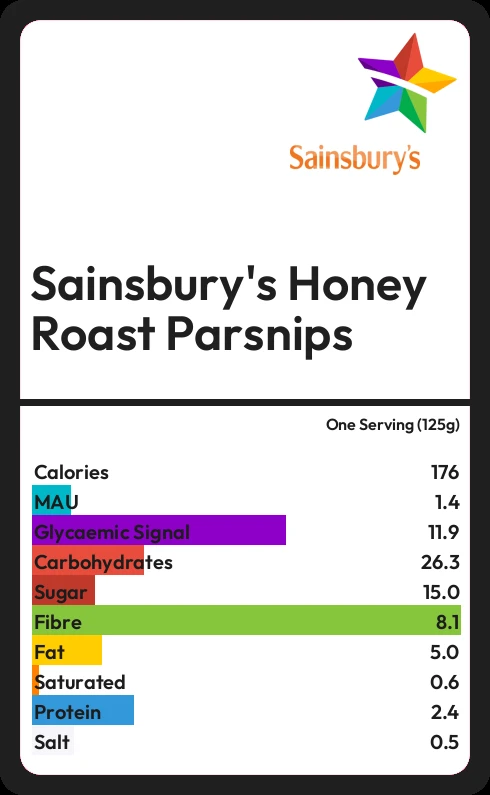 Sainsbury's Honey Roast Parsnips contains 15.0g sugar in one Serving (125g) - that is around 4 cubes of sugar.