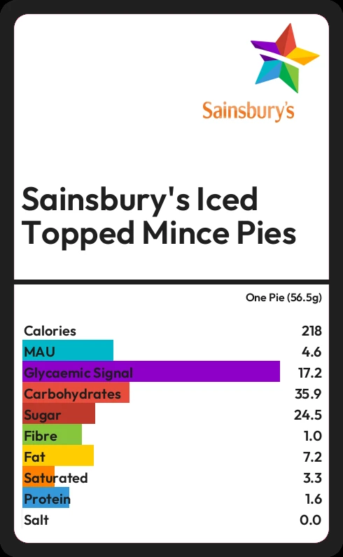 Sainsbury's Iced Topped Mince Pies contains 24.5g sugar in one Pie (56.5g) - that is around 6 cubes of sugar.