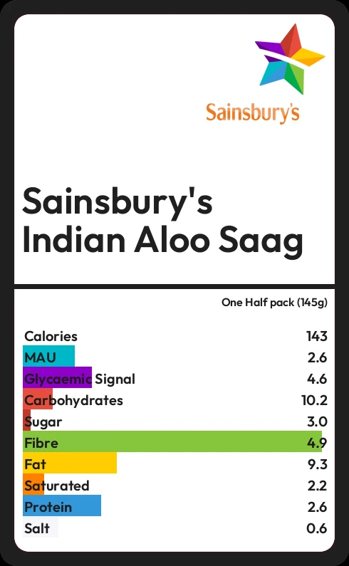 Sainsbury's Indian Aloo Saag contains 143.6 calories in one Half pack (145g).