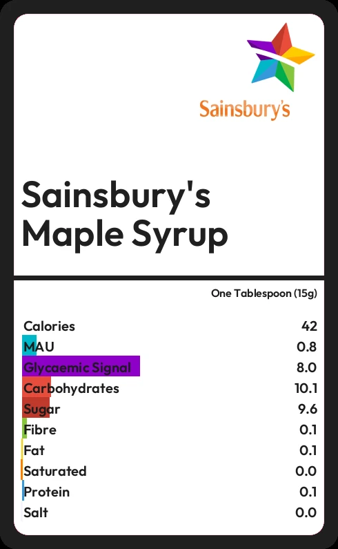 Sainsbury's Maple Syrup contains 41.6 calories in one Tablespoon (15g).