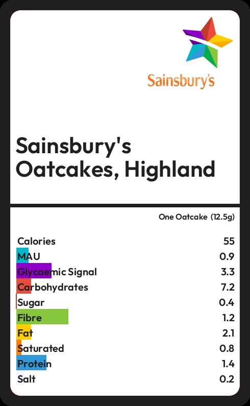 Sainsbury's Oatcakes, Highland contains 55.3 calories in one Oatcake (12.5g).
