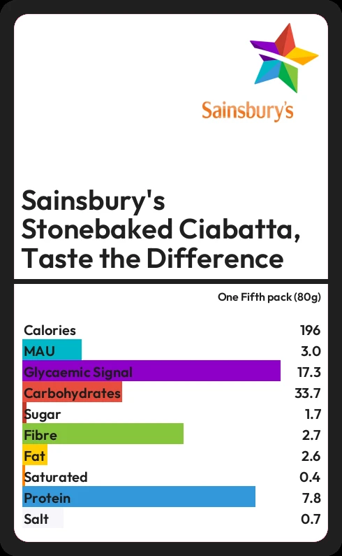 Sainsbury's Stonebaked Ciabatta, Taste the Difference contains 1.7g sugar in one Fifth pack (80g)