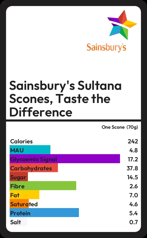 Sainsbury's Sultana Scones, Taste the Difference contains 242.2 calories in one Scone (70g).
