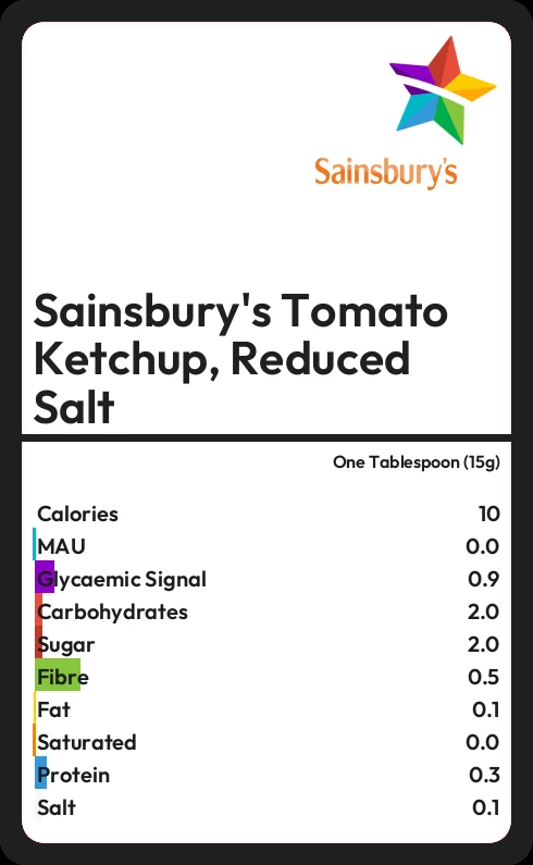 Sainsbury's Tomato Ketchup, Reduced Salt contains 10.4 calories in one Tablespoon (15g).