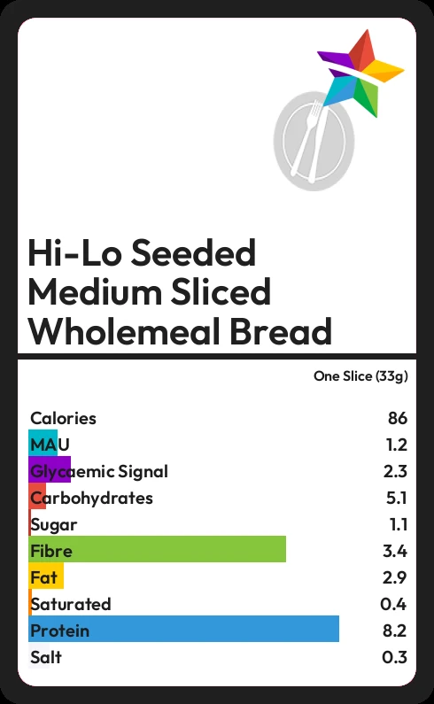 Hi-Lo Seeded Medium Sliced Wholemeal Bread contains 1.1g sugar in one Slice (33g)
