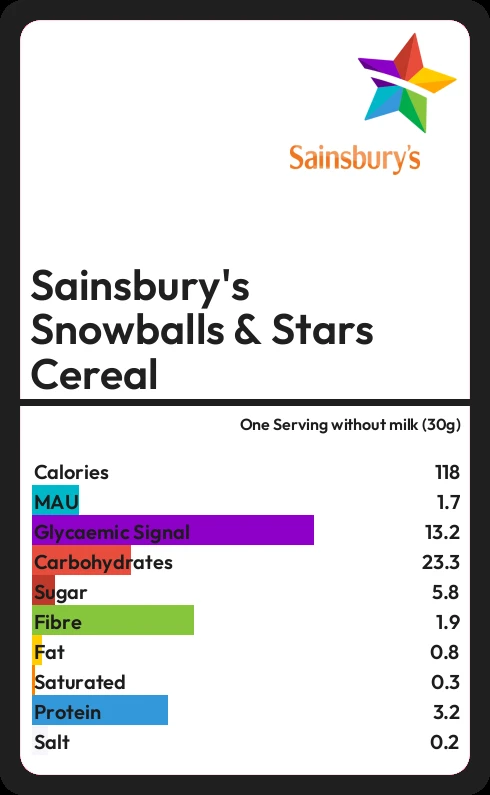 Sainsbury's Snowballs & Stars Cereal contains 117.9 calories in one Serving without milk (30g).