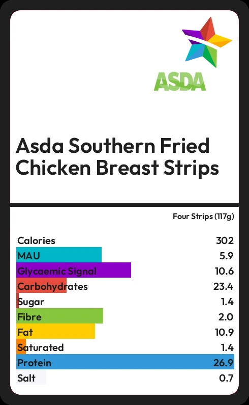 Asda Southern Fried Chicken Breast Strips contains 301.9 calories in four Strips (117g).