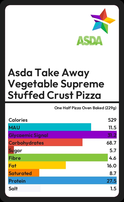 Asda Take Away Vegetable Supreme Stuffed Crust Pizza contains 529 calories in one Half Pizza Oven Baked (229g).