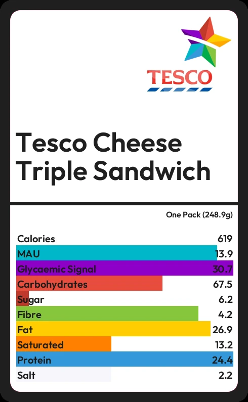 Tesco Cheese Triple Sandwich contains 619.8 calories in one Pack (248.9g).