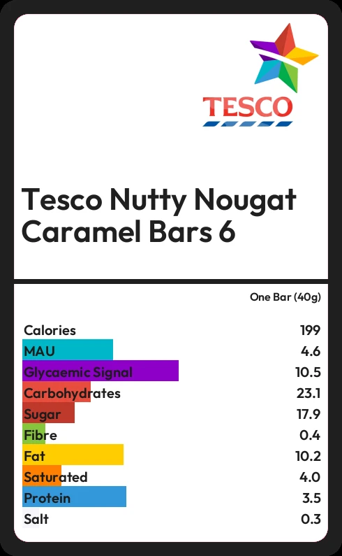 Tesco Nutty Nougat Caramel Bars 6 contains 198.8 calories in one Bar (40g).