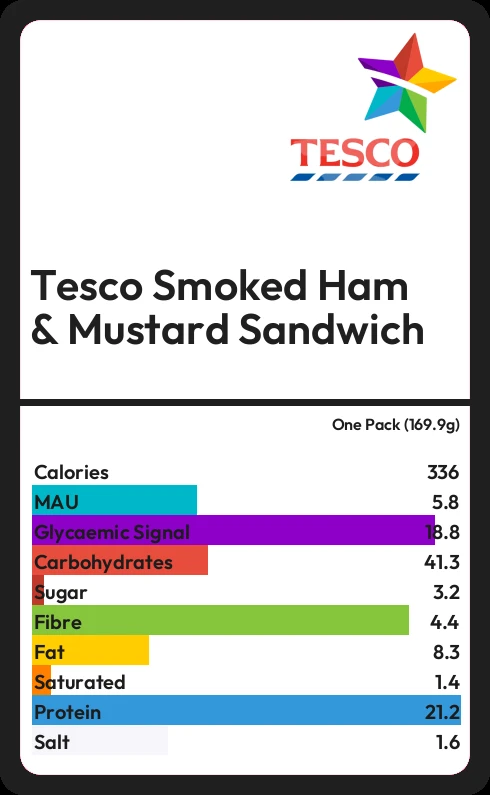 Tesco Smoked Ham & Mustard Sandwich contains 336.4 calories in one Pack (169.9g).