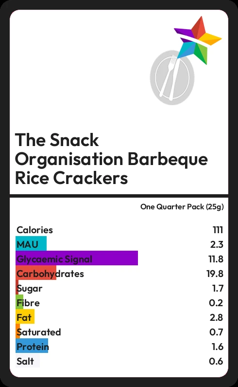 The Snack Organisation Barbeque Rice Crackers contains 1.7g sugar in one Quarter Pack (25g)