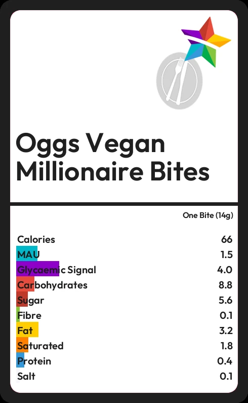 Oggs Vegan Millionaire Bites contains 5.6g sugar in one Bite (14g) - that is around 1 cube of sugar.