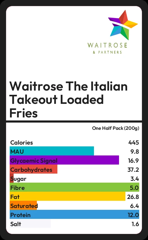 Waitrose The Italian Takeout Loaded Fries contains 446 calories in one Half Pack (200g).