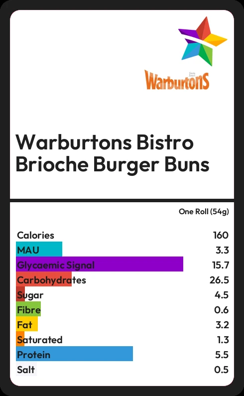 Warburtons Bistro Brioche Burger Buns contains 159.8 calories in one Roll (54g).