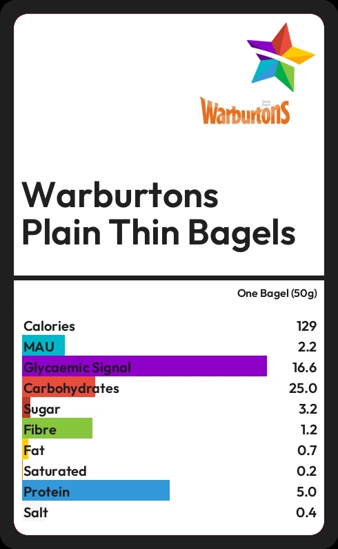 Warburtons Plain Thin Bagels contains 129 calories in one Bagel (50g).