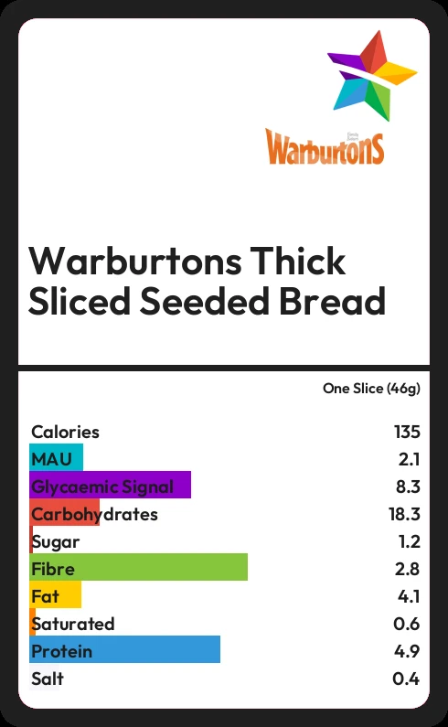 Warburtons Thick Sliced Seeded Bread contains 1.2g sugar in one Slice (46g)