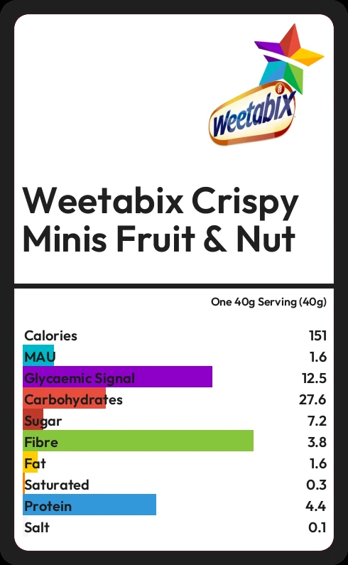 Weetabix Crispy Minis Fruit & Nut contains 151.2 calories in one 40g Serving (40g).