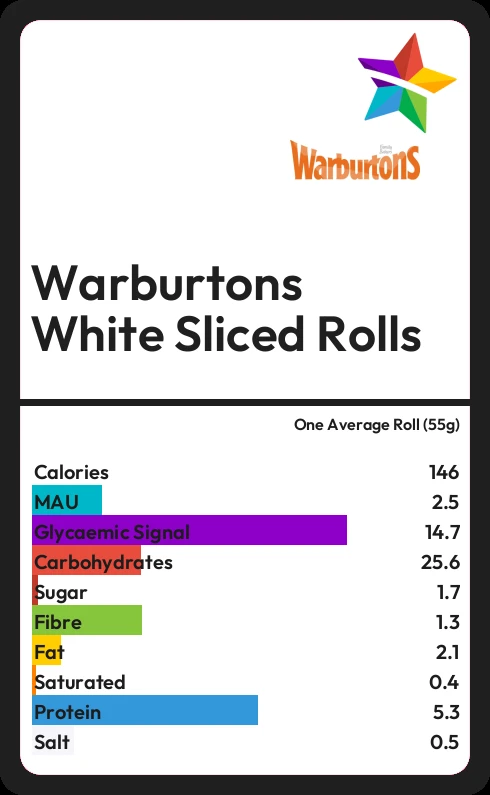 Warburtons White Sliced Rolls contains 1.7g sugar in one Average Roll (55g)