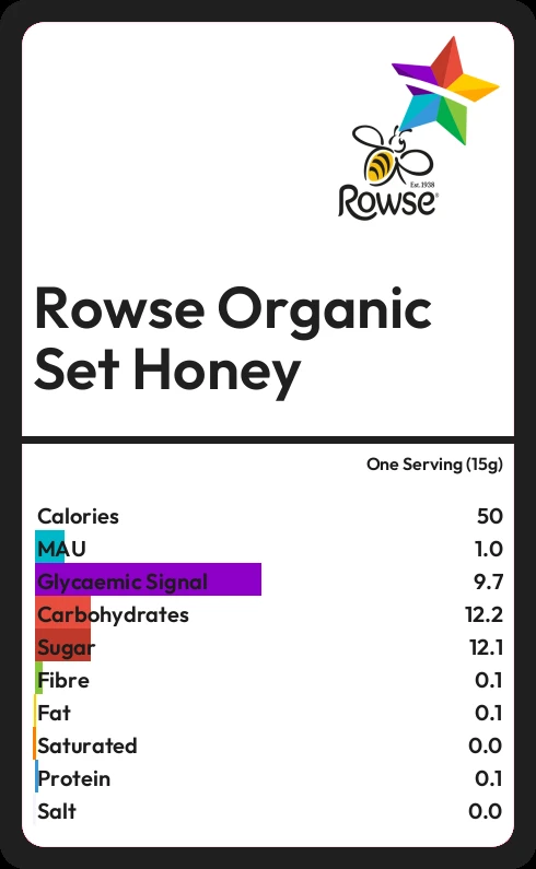 Rowse Organic Set Honey contains 12.1g sugar in one Serving (15g) - that is around 3 cubes of sugar.