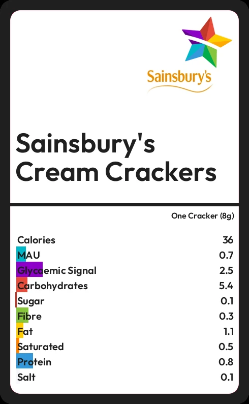 Sainsbury's Cream Crackers contains 0.1g sugar in one Cracker (8g)