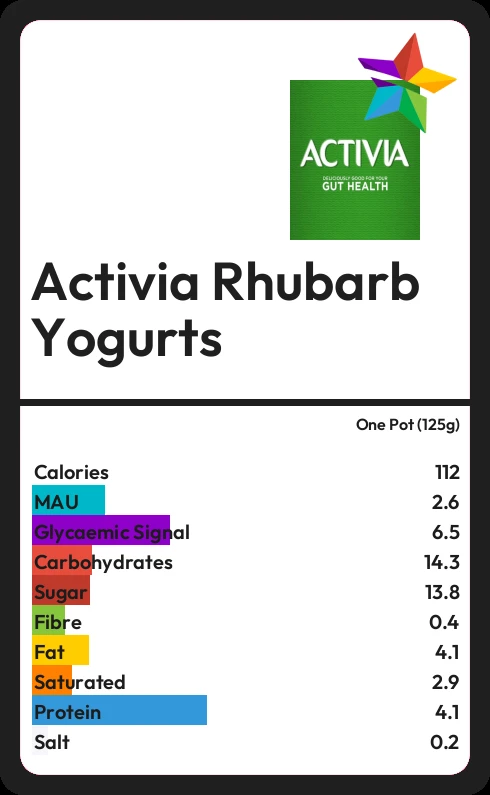 Activia Rhubarb Yogurts contains 111.3 calories in one Pot (125g).