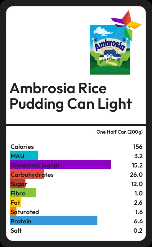 Ambrosia Rice Pudding Can Light contains 156 calories in one Half Can (200g).