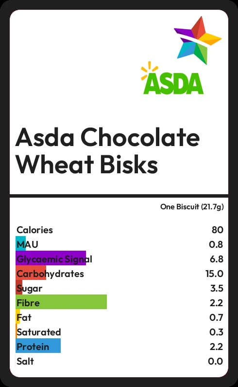 Asda Chocolate Wheat Bisks contains 80.3 calories in one Biscuit (21.7g).