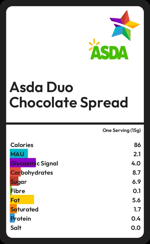 In one Serving (15g) of Asda Duo Chocolate Spread there are 5.6g of fat of which 1.7g are saturated.