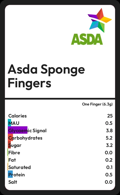 Asda Sponge Fingers contains 25.1 calories in one Finger (6.3g).