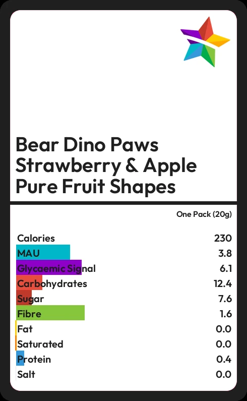 Bear Dino Paws Strawberry & Apple Pure Fruit Shapes contains 7.6g sugar in one Pack (20g) - that is around 2 cubes of sugar.