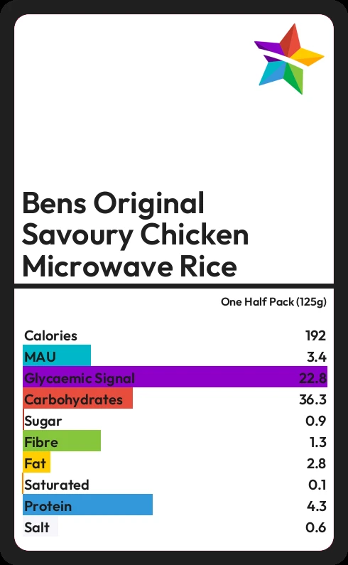 Bens Original Savoury Chicken Microwave Rice contains 0.9g sugar in one Half Pack (125g)