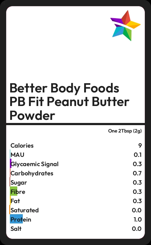 Better Body Foods PB Fit Peanut Butter Powder contains 8.9 calories in one 2Tbsp (2g).