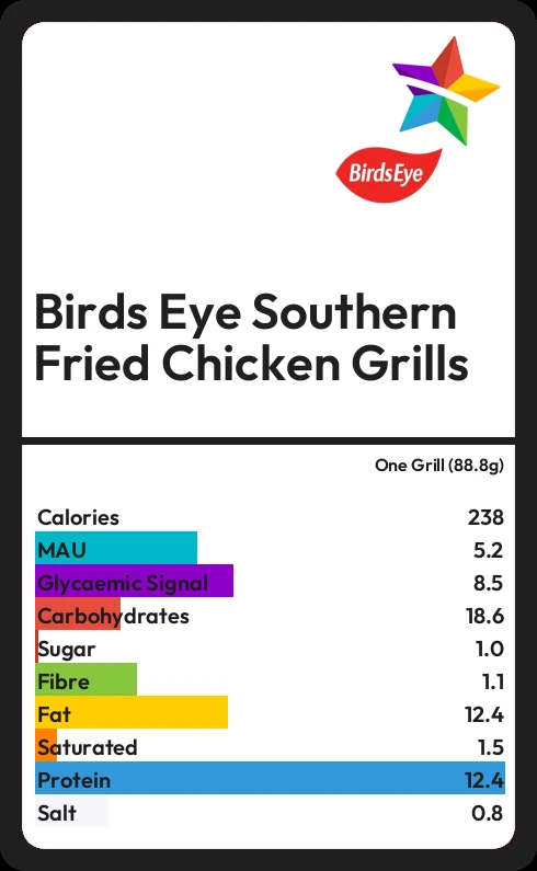 Birds Eye Southern Fried Chicken Grills contains 1.0g sugar in one Grill (88.8g)