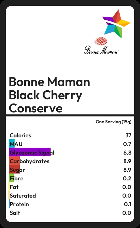 Bonne Maman Black Cherry Conserve contains 8.9g sugar in one Serving (15g) - that is around 2 cubes of sugar.