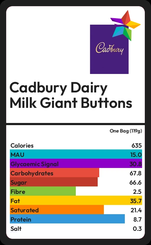 Cadbury Dairy Milk Giant Buttons contains 66.6g sugar in one Bag (119g) - that is around 17 cubes of sugar.