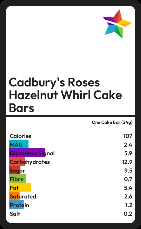 Cadbury's Roses Hazelnut Whirl Cake Bars contains 106.8 calories in one Cake Bar (24g).