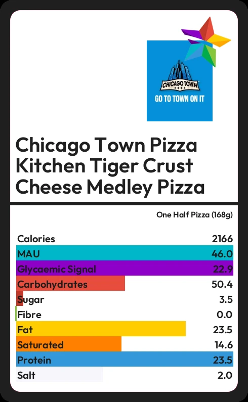 Chicago Town Pizza Kitchen Tiger Crust Cheese Medley Pizza contains 2 calories in one Half Pizza (168g).